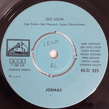 Vaaleansininen etiketti. Vasemmalla musta His Master's Voicen 'koira ja grammari' -kuvalogo raameissa. Hieman kirjoitusta (> edellisen omistajan etunimi + nimikirjaimet) B-puolen keskiössä.