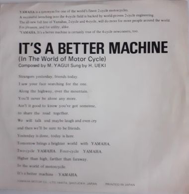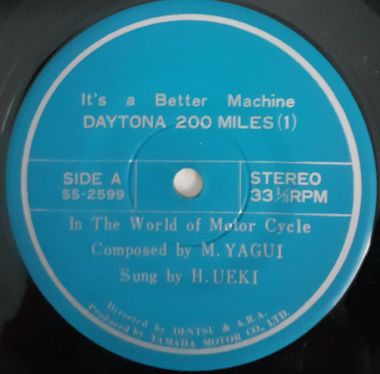| A strange one, advertising Yamaha motor cycles, with narration and field recordings from the Daytona 200 Miles '72 race, I should think. On side A H. Ueki sings an English language song "In the World of Motor Cycle", composed by M. Yagui.