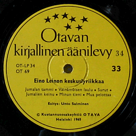 | Keltainen etiketti. Musta Otavan tähtilogo ylhäällä. Vuosiluku 1965 alareunassa. |  | Laminoidut kannet. Muutama pikkuryppy reunoissa. Takakannessa lista julkaistuista Otavan kirjallisista levyistä numeroon 33 asti. |