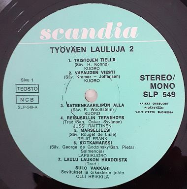 | Vaaleansininen etiketti. Ylhäällä valkoinen Scandia-logo. STEREO / MONO teksti oikealla. |  | Kiiltävät kannet. Etupuolella kevyttä pintakulumaa ja hentoa kirjoitusta (> hinta > oikealla > ylhäällä). Takana vähäisiä likajälkiä. Reunoissa hieman kulumaa ja pikkuryppyjä. Karvan verran kuluneet kulmat. Takakannen teksteistä vastaa Pekka Gronow. |
