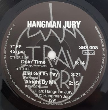 | A-puoli: Valkomusta Hangman Juryn kuvaetiketti. B-puoli: Musta etiketti valkoisella tekstillä. Pohjalla hopeinen Strawberry Recordsin logo. |  | Ruskeasta aaltopahvista valmistetut kuvakannet, jotka on suljettu takaa Strawberry Recordsin tarralla. Etupuolen vasemmassa yläkulmassa pieni reunarepeämä. Kaksi hieman ruttaantunutta kulmaa. |