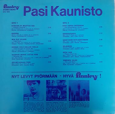 Sinivalkoinen etiketti. Vasemmalla sinimusta Finnlevyn 'f'-kuvalogo.Kiiltävät kannet. Reunoissa jonkin verran kulumaa ja pikkuryppyjä. Karvan verran kuluneet kulmat.