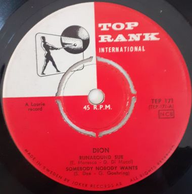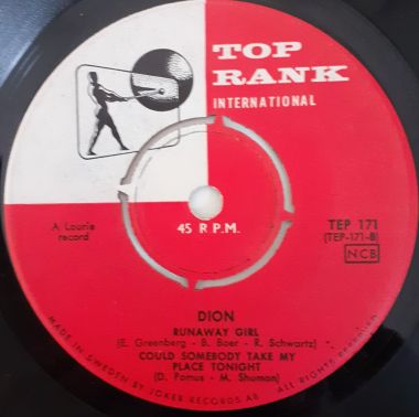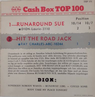 | A highly succesful American pop, rock, doo-wop, blues, r&b and folk singer, songwriter and guitarist, born Dion Francis DiMucci in 1938 in The Bronx, New York. Swedish only 4-track ("Runaround Sue" / " Somebody Nobody Wants" // "Runaway Girl" / "Could Somebody Take My Place Tonight") EP from 1961.