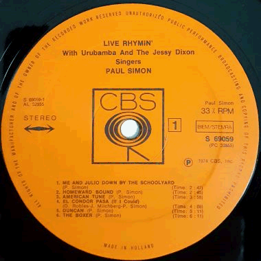 | A highly popular American singer-songwriter, born in 1941 in Newark, New Jersey, best remembered from Simon & Garfunkel. Recorded live with Urubamba and the Jessy Dixon Singers. A total of 12 tracks including old and new hits like "The Boxer", "El Condor Pasa", "Mother and Child Reunion", "Bridge Over Troubled Water" and "The Sound of Silence". Dutch issue of Columbia PC 32855 (USA 1974). His 1st live album, released in March 1974.