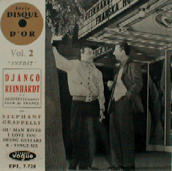 One of the greatest jazz guitarist of all time, born Jean Baptiste Reinhardt in 1910 in Liberchies, Pont-à-Celles, Belgium. 4-track EP credited to Django Reinhardt et le Quintette de Hot Club de France avec Stephane Grappelly (Django, Grappelli, Joseph Reinhardt, Eugene Vees and Fred Ermelin). "Ol' Man River", "I Love You", "Swing Guitars" and "R-Vigt-Six", all recorded November 21st, 1947 for the French Broadcasting Company. A beautiful copy!