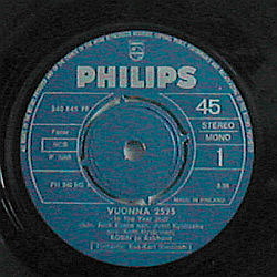 Tummansininen etiketti hopeateksteillä. Ylhäällä hopeinen Philips-logo.Philipsin muovinen levypussi, ruttaantunut tosin.