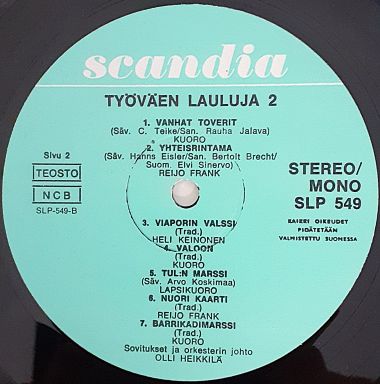 | Vaaleansininen etiketti. Ylhäällä valkoinen Scandia-logo. STEREO / MONO teksti oikealla. |  | Kiiltävät kannet. Etupuolella kevyttä pintakulumaa ja hentoa kirjoitusta (> hinta > oikealla > ylhäällä). Takana vähäisiä likajälkiä. Reunoissa hieman kulumaa ja pikkuryppyjä. Karvan verran kuluneet kulmat. Takakannen teksteistä vastaa Pekka Gronow. |