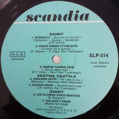 | Jonkin verran hiusnaarmuja ja kevyitä pinta- / neulanjälkiä, ei mitään vakavaa. Soi vallan hyvin kera satunnaisten pikkurutinoiden. Matriisinumerot (painettu): SLP 514 A / SLP 514 B. |  | Mukana vajaakuntoinen originaali Scandian sisäpussi. |