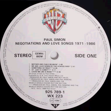 | A highly popular American singer-songwriter, born in 1941 in Newark, New Jersey, best remembered from Simon & Garfunkel. A compilation album of previously released solo material from 1971 to 1986, opening with "Mother and Child Reunion" and closing with "Graceland". European issue, manufactured in Germany. Released in October 1988.