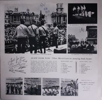A highly popular pop from Barbados, mixing styles from calypso and Latin to folk and worldwide hits, active from the early 1960s. Credited to The Merrymen (the back cover reads Merrimen) featuring Emile Straker, their lead singer and a whistling master. A total of 14 tracks, including e.g. "La Bamba", "Yesterday" and "Where Have All the Flowers Gone". Stereo issue of their 4th or so album, released on band's own record label.