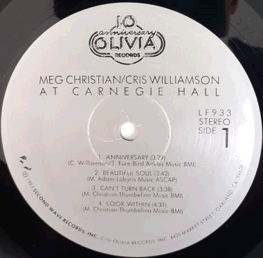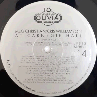 | Two highly important / influential American feminist singer-songwriters joining forces. Recorded live in 1983 in celebration of the tenth Anniversary of Olivia Records. Songs by e.g. Williamson, Christian, Margie Adam and Wendy Waldman, closing with a nice version of "Ain't No Mountain High Enough" (Asford & Simpson).