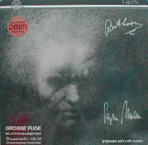 Side A: Grosse Fuge für Klavier zu vier Händen op. 134 (Version für eien Spieler mit computergestütztem Konzertflügel) / Fünf Klavierstücke. Side B: Sechs Bagatellen op. 126. Stephan Möller plays Bösendorfer 290 SE computer-supported concert grand piano. Digital recording, first edition.