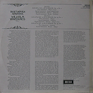 | Beethoven's "Sonata No. 2 in A Major, Op. 2, No. 2", "Sonata No. 10 in G Major. Op. 14, No. 2" and "Sonata No. 19 in G Minor, Op. 49, No. 1", played by Wilhelm Backhaus (piano). Mono issue, sample record.