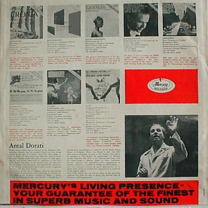 Red labels with silver print. Silver Mercury "double oval" picture logo on top. All text in English.Laminated (> front only) single cover. Light lamination bubble on front, along the spine. Water stains on back (> bottom & right). Some corner wear. "Living Presence Hi-Fi 35 mm. An original 35 mm magnetic film recording" band on front (> bottom). All text in German.