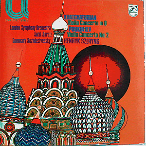 | Henryk Szeryng plays Khachaturian's "Violin Concerto in D" and Prokofiev's "Violin Concerto No. 2 in G minor, Op. 63". Accompanied by the London Symphony Orchestra conducted by Antal Dorati (Khachaturian) and Gennadi Rozhdestvensky (Prokofiev). Dutch Philips Universo Series issue.