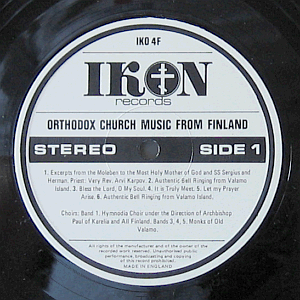 Folded lyric sheet (in English), Finnish language info sheet, Archbishop Paul's letter 'An appeal for the reconstruction of Valamo monastry' (in English, ) and Ikon Records 'contact coupon' enclosed.