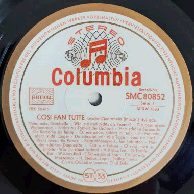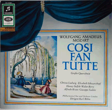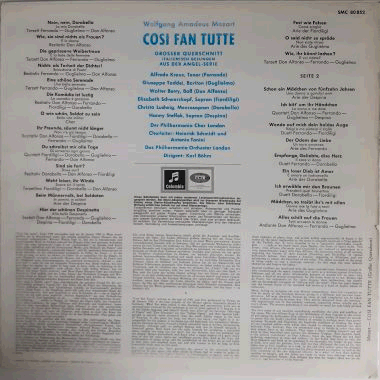 Highlights from Mozart's opera "Cosi Fan Tutte", sung in Italian. Recorded in London in 1962. Mid / late 1960s German "Highlights from the Angel Series" stereo issue.