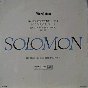 Beethoven's "Concerto No. 1 in C major, Op. 15" (side A) and "Sonata No. 27 in E minor, Op. 90" (side B),m performed by Solomon (Cutner) with (side A) the Philharmonia Orchestra conducted by Herbert Menges. Original UK mono issue.