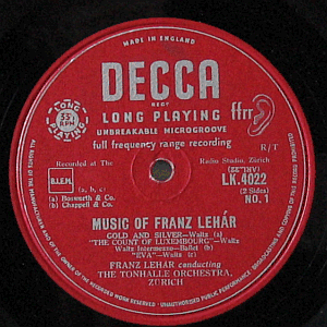 | Franz Lehár conducting in 1947 overtures and waltzes from his operettas with the Tonhalle Orchestra, Zürich. These recordings were made by English Decca for a series of 78 rpm records. The recordings had remarkable sound for their time because they were made using Decca's Full Frequency Range Recording process, one of the first commercial high fidelity techniques. Released for the first time on vinyl in the early 1950s. Mono.
