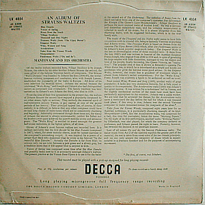 | Dark red labels with silver print. Unboxed silver Decca 'ffrr ear' picture logo on top. Tax / price code N on each side. |  | Semi-matt flipback single cover, about half of the lower flap is missing. A few edge tears on front (> bottom). Partially split seams and spine, restored with glue & paper (> inside). Wear along the edges. Some corner wear, one of the corners (> bottom > right) being also slightly bent. Date 54/11 printed on back. |