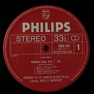 Joseph Haydn's "Symphony in G major, Hob. I:100 - The Military Symphony" and "Symphony in E-flat major, Hob. I:103 - The Drumroll Symphony". Performed by the Academy of St. Martin-in-the-Fields orchestra, conducted by Neville Marriner.
