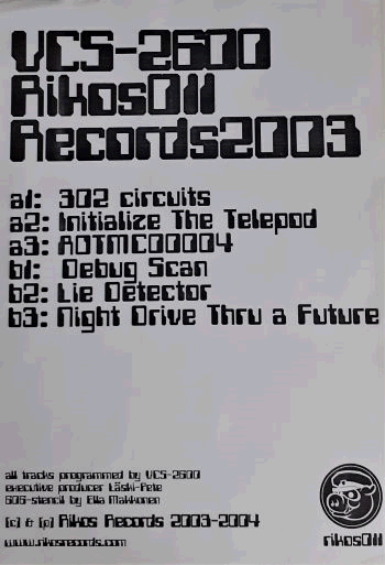 | A weird treasure! 6 track 12 inch 33 rpm extended play or mini album of electronic techno beats, programmed by VCS-2600 synthesizer. As far as I've read elsewhere, the mastermind behind the 12-incher is Albert Kuningas, better known for his UFO-based music & video projects. I guess Rikos Records only released something like 200 copies in silkscreen printed covers, all slightly different to each other (making it hard to give the cover a definite grade). Rare as hell these days!