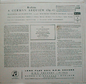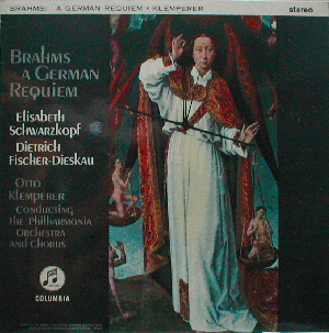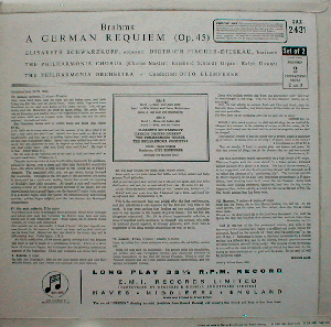 | Brahms' largest work which made him an international name, written for an orchestra, chorus and two soloists. Otto Klemperer's legendary 1962 version with Elisabeth Schwarzkopf and Dietrich Fischer-Dieskau. A set of two separate albums. 2nd stereo pressing, issued also on mono as 33 CXS 1781 and 33 CX 1782.