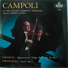 | Italian-born British Alfredo Campoli plays Pablo de Sarasate's "Zigeunerweisen, Opus 20, No.1" and Henryk Wieniawski's "Légende, Opus 17" with The London Symphony Orchestra conducted by Pierino Gamba. Very early mono issue.