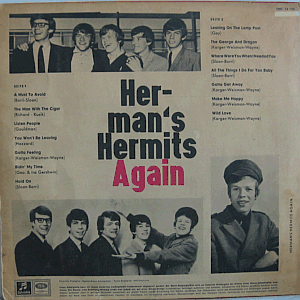 | A popular English beat / pop band, formed in 1963 in Manchester as Herman & The Hermits. Rare German only 14-track compilation album, including songs "A Must to Avoid", "Listen People", "Hold On", "Leaning on the Lamp Post" and "Gotta Get Away". Electronically enchanched for 'stereo', I should think.