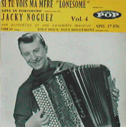 Well-known French accordion player. Previously released material from the late 1950s: "Si tu vois ma mere" (slow-rock) / "Obras" (tango) // "Love in Portofino" (bolero-cha-cha) / "Tout doux, tout doucement" (calypso-rock). Credited to Jacky Noguez - son accordeon et son ensemble musette.