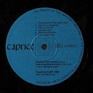 | Blue labels. Black Caprice 'square & circles' picture logo on the left / in the middle. |  | Laminated fold-out cover with two extra pages. A few tiny creases along the edges. Slightly worn corners. |