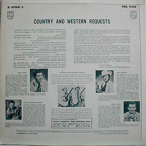 A great early country music / bluegrass compilation! A total of 14 songs by Bill Monroe and his Blue Grass Boys (3), Roy Acuff and his Smoky Mountain Boys (4), Carl Smith (2), Lester Flatt, Earl Scruggs and The Foggy Mountain Boys (3), 'Little' Jimmy Dickens (2). Mono.