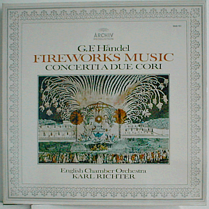 Handel's "Fireworks Music" and "Concerti a due cori: No. 2 in F major & No 3. in F major". Recorded in January 1972 in the Brent Town Hall, Wembley, London, England by Karl Richter and the English Chamber Orchestra. Late 1970s pressing, I should think.