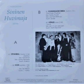 | Tästä 9-henkisestä ryhmästä en tiedä juuri mitään. Netistä kuitenkin selvisi, että entinen tanssiorkesteri Sininen Huvimaja operoi nykyisin bilebändi Sininen Huvimajana. Ainoana yhteisenä tekijänä taitaa olla pianisti Heikki Prokkola. Anyway, 1990-luvun alussa yhtye julkaisi omakustanteena LP-levyn nopeudella soivan EP:n, jonka neljä cover-biisiä ovat: "Istanbul" / "Kun" // "Kuningaskobra" / "Venus". Ihan on pätevää meininkiä, levynäkin vallan harvinainen.