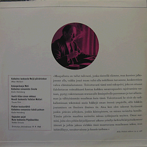 | Punainen etiketti. Yläreunassa musta teksti WSOY. ÄÄNILEVY. |  | Kiiltäväpintaiset 'flipback'-kannet. Kevyitä pintanaarmuja / -jälkiä molemmin puolin. Hyvin vähäistä kulumaa ja jokunen pikkuryppy reunoissa. Karvan verran kuluneet kulmat. |