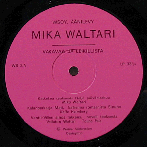 | Mika Waltari (Katkelma teoksesta "Neljä päivänlaskua", Kalle Holmberg (Katkelmat "Kalanperkaaja Meti" ja Poikien kouluunlähtö" romaaneista "Sinuhe" ja "Isästä poikaan"), Tauno Palo "Novelli "Ventti-Villen ainoa rakkaus" teoksesta "Vallaton Waltari" ja Veikko Sinisalo (Runo "Vapauden pojat" teoksesta "Pöytälaatikko") lukevat Mika Waltarin tekstejä. Ensiesitys Yleisradiossa 19.9.1968. Hyvin harvinainen!