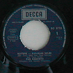 Tumma sinivioletti etiketti hopeateksteillä. Ylhäällä Decca-logo hopealaatikossa.