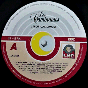 labels with black print. Boxed LMC picture logo on the right. |  | Semi-glossy single cover. A few light creases along the edges. One slightly worn corner (> bottom > right). EL DISCO ES CULTURA HECHO EN MEXICO text on back. |