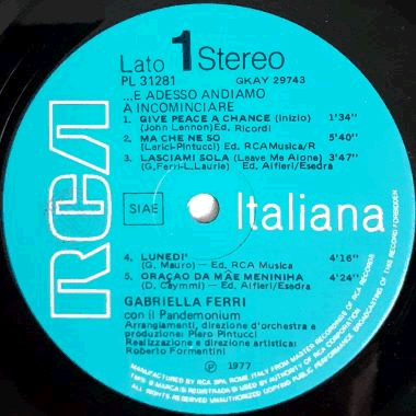 A popular Italian pop singer and actress, born in 1942 in Rome. Her 10th or so album, opening & closing with John Lennon's "Give Peace a Chance".