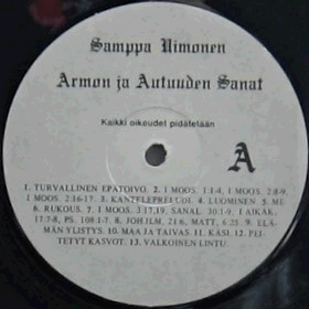 | Valkoinen etiketti mustalla tekstillä. Ei levy-yhtiön nimeä / logoa, ei katalooki- / tilausnumeroa. |  | Laminoidut kannet. Reunoissa vähäistä kulumaa (> ylhäällä, keskellä) ja jokunen pikkuryppy. Painettu Suomenselän Offset Oy:ssä, Virroilla. |