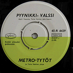 Keltainen (> alaosa) ja valkoinen etiketti. Vasemalla pieni musta Rytmi-logo raameissa.