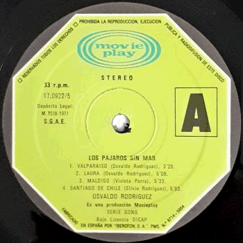 | Light green 'octagon' labels. Darker green Movieplay picture logo at the top. Serie Gong text at the bottom. Titled as "Los Pajaros Sin Mar". |  | Laminated fold-out cover. Light discoloration on front (> right). A few light creases along the edges. Some corner wear (> bottom > right). Titled "Les Oiseaux Sans Mer". |