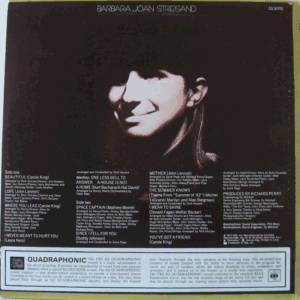 | A world-famous American singer, actress etc., born in 1942 in Williamsburg, Brooklyn, New York. Quadraphonic edition of Columbia KC 30792 (USA 1971), containing alternate takes, different vocals, and different mixes. Her 13th or so album.