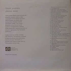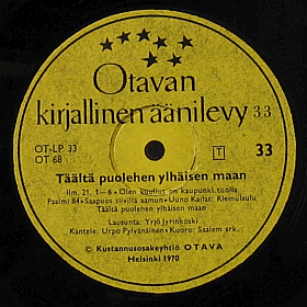 | Keltainen etiketti. Ylhäällä iso musta Otavan kirjallinen äänilevy kuvalogo. Alhaalla musta 'Kustannusosakeyhtiö OTAVA Helsinki 1970' präntti. |  | Kiiltävät kannet. Jokunen pikkuryppy etupuolella. Reunoissa karvan verran kulumaa ja pikkuryppyjä. Takana lista sarjassa ilmestyneistä levyistä, viimeisenä "Täältä puolehen ylhäisen maan". |