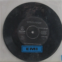 Musta etiketti hopeateksteillä. Vasemmalla hopeinen Parlophonen '£'-kuvalogo.