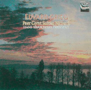 Hans Swarowski conducting Edvard Grieg's "Peer Gynt Suite Nr. 1, Op. 46" (side A) and "Peer Gynt Suite Nr. 2, Op. 55" (side B).