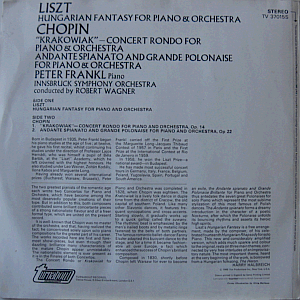 | Franz Liszt's "Hungarian Fantasy for Piano and Orchestra" and Frederic Chopin's "Krakowiak - Concert Rondo for Piano and Orchestra, Op. 14" and "Andante Spianato and Grande Polonaise for Piano and Orchestra, Op. 22" peformed by Peter Frankl (piano) with the Innsbruck Symphony Orchestra, conducted by Robert Wagner. Early 1970s edition, I should think.