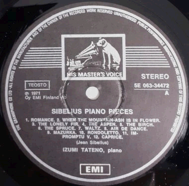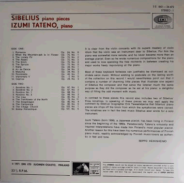 | Black labels with silver print and rim. Boxed black & white His Master's Voice 'Nipper' picture logo above the centre hole. Boxed white EMI logo at the bottom. |  | Semi-glossy single cover. Some surface wear (> top & bottom > middle) on front. Light wear and a few small creases along the edges. Slightly worn corners. English language sleeve notes on back, written by Seppo Heikinheimo. |