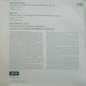 | Mendelssohn's "Concerto in E minor for Violin & Orchestra, Op. 64" and Bruch's "Concerto No. 1 in G minor for Violin & Orchestra, Op. 26", performed by Ion Voicou (Voicu) with The London Symphony Orchestra, conducted by Rafael Frühbeck de Burgos. Early stereo edition.