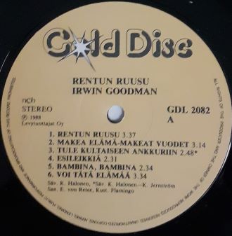 | Oranssinkeltainen etiketti. Ylhäällä iso Gold Discin kuvalogo. |  | Kiiltävät kannet. Reunoissa vähäistä kulumaa ja pikkuryppyjä. Karvan verran kuluneet kulmat. |
